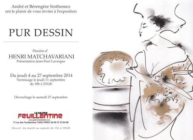 PUR DESSIN Dessins d’Henri Matchavariani Au début, le papier dont le grain appelle la caresse. Puis le trait fluide et vigoureux, lancé comme à la pointe du fleuret, aboutissement d’un geste né au plus profond du corps. Ensuite la retenue toute orientale de Matchavariani qui ne donne à voir – et à ressentir – que l’essentiel, trace subtile et fascinante du sens et de l’émotion qu’il a pris le temps de laisser mûrir. Chez lui, toute forme respire, dialogue avec le vide, palpite d’une énergie qui confine à l’étrange. La vivacité du mouvement s’impose et nous montre d’un coup cet essentiel dans toute sa richesse. L’ensemble des oeuvres exposées à la Galerie Feuillantine met en évidence la lumineuse unité du trait au fil du temps, d’un seul trait traversant les années, toujours plus clair, toujours plus pur, dans toute sa puissance. Jean Paul Lavergne _______________________________