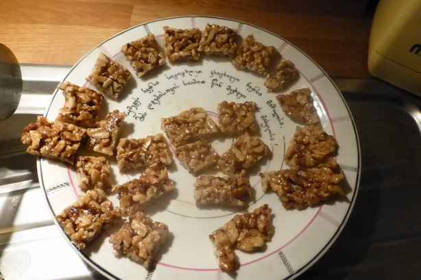 მომზადების წესი: RECETTE · გაარჩიეთ ნიგოზი და დაჭერით თხლად. დაჭრილი ნიგოზი მოხალეთ ნელ ცეცხლზე დაწითლებამდე. თან გამუდმებით ურიეთ. · Couper finement les cerneaux dans le sens de la longueur · გადმოდგით ცეცხლიდან, გააგრილეთ და გააცალეთ კანი. · სქელძირიან ღრმა ტაფაში ჩაასხით თაფლი და ადუღეთ დაბალ ცეცხლზე, თან გამუდმებით ურიეთ. თაფლი დუღილს რომ დაიწყებს, გადმოდგით ცეცხლიდან. ასე გაიმეორეთ რამდენჯერმე, სანამ წყლიან ჭურჭელში ჩაწვეთებისას თაფლი არ გამაგრდება. · Verser le miel dans une casserole sur petit feu et au moment où il commence à entrer en ébullition, retirer la casserole du feu , et recommencer l’opération tant que le miel pris au bout d’une petite cuiller ne se fige pas dans un petit récipient d’eau froide…