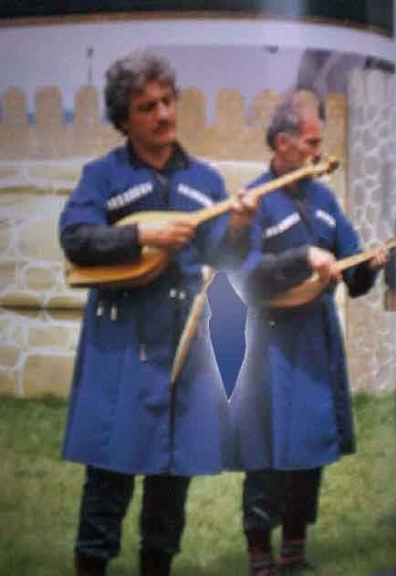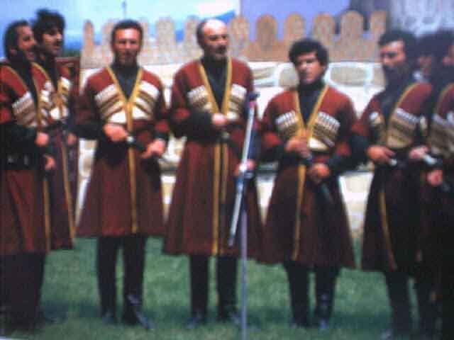 | "Tskhenosnouri" chant de cavaliers de la région d'Imerethie que vous pouvez écouter en cliquant sur la photo ci-dessous, est un de ceux qui caractérise le mieux cette polyphonie. Il est interprété par le célèbre ensemble Roustavi, dirigé par Anzor Erkomaïchvili, qui s'est maintes fois produit en France. |