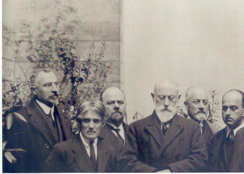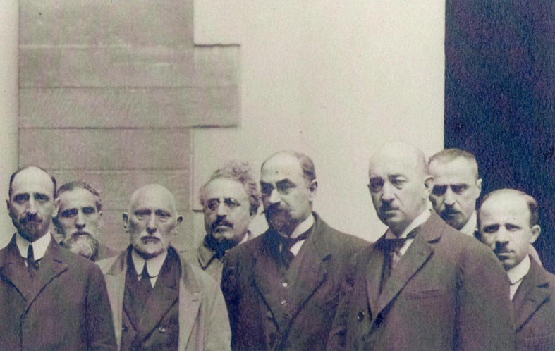 Les membres du gouvernement géorgien en exil en France (1) : MM. Rajden ARSÉNIDZÉ, Gricha OURATADZÉ, Akaki TCHKHENKÉLI, Noé JORDANIA, X, et Datiko CHARACHIDZÉ.