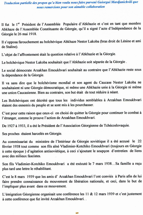 « Il est nécessaire et indispensable de fusionner l’Abkhazie à la Géorgie et de saper à la base tout prétexte pouvant conduire à leur séparation. C’est pour cette raison que les collègues.. collaborateurs de Géorgie doivent traiter avec une extrême prudence l’Abkhazie qui est la porte d’entrée de la Géorgie occidentale. La question Abkhaze traitée avec justice et pertinence doit être au centre de toute préoccupation des associations d’émigration. Vous savez tout cela et vous devez maintenant bannir tout manque d’attention vis à vis de l’Abkhazie comme le demandent désormais le intérêts le l’Abkhazie et de la Géorgie. ================================================================== Quelques rappels historiques qui ont leur importance : Une longue tradition d’amitié unit les peuples Abkhazes et Géorgiens , c’est ainsi que : L’âge d’or de David IV le Bâtisseur et de Thamar a été caractérisé par des personnalités politiques, publiques et militaires géorgiennes célèbres tels que David Vatchnadze Cercle des Etudes Caucasiennes //, qui à Paris dans le cadre «Des études de race blanche au Cercle des Etudes Caucasiennes » a présenté le 17 Janvier 1933 un rapport sur « la tradition d’unité entre les nations dans l’histoire du Caucase » Voici ce qu’il écrivait sur la période fondatrice de l'Age d'Or du Caucase :