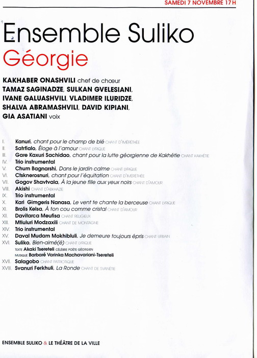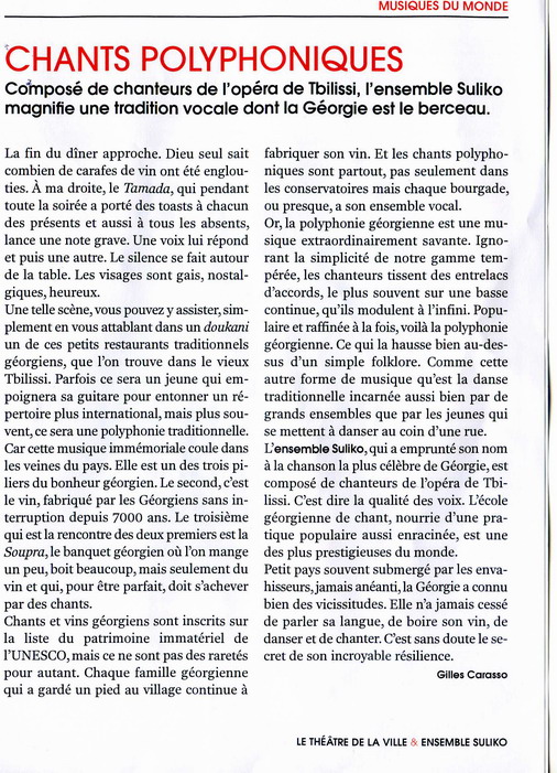 Ils sont huit, musiciens et chanteurs, dirigés par Kakhaber Onashvili, chef de chœur et fondateur de l’ensemble Suliko. Neuf hommes qui livreront les subtilités mélodiques des chants polyphoniques géorgiens, désormais inscrits au patrimoine culturel immatériel de l’UNESCO. Mêlant poésie populaire, chants sacrés de l’âge d’or géorgien et compositions modernes, l’ensemble Suliko, doté de voix puissantes qui savent se faire patte de velours, offre un étonnant voyage vocal et instrumental