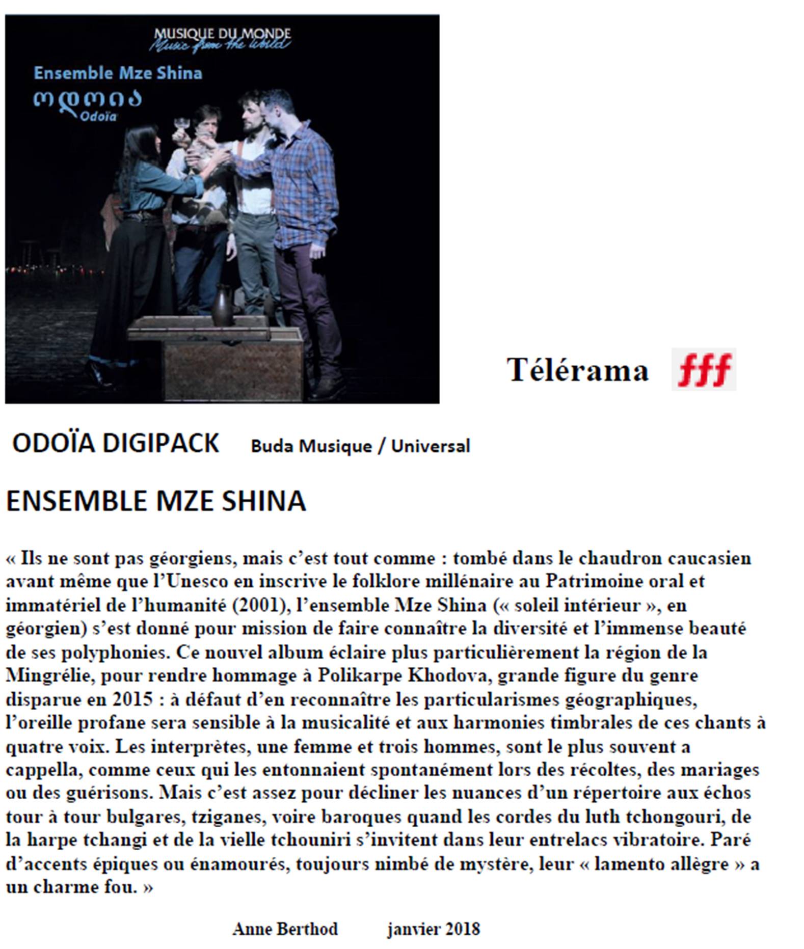 Chanteurs & chanteuses : Othar Pataridzé ; Gouram Assathiani; Mixeïl Vodé ; Merab Odichèlidze ; Zoltan Jordania ; Othar Zourabichvili ; Gogui Keresselidzé ; Salome Zourabichvili ; Eliane Brichler ; Catherine Tsitsichvili ; Irène Tsitsichvili ; Kato Odichèlidzé ; Lia Vodé ; Christine Toullec ; Daredjane Berekachvili; Thinatine Berekachvili