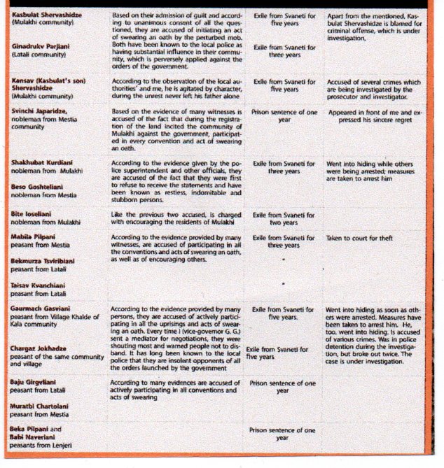 გუბერნიის პოლიციამ, პროკურატურამ და მმართველობამ სვანეთის აჯანყების მოთავეებად მიჩნეულ 16 კაცს ასეთი საბრალდებო საქმე შეუდგინეს The police, procurator’s office and the authorities of Svaneti filed the following suits against 16 persons considered to be the leaders of Svaneti revolt .