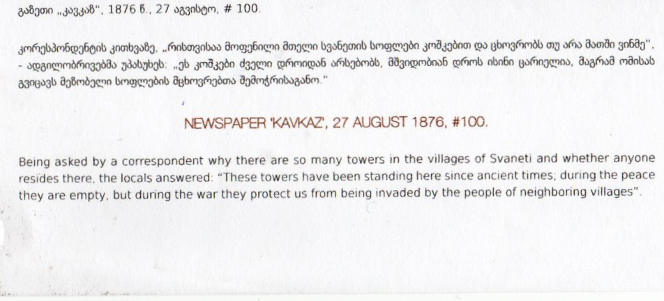 Extrait de la page 424 de « Histoire de la Nation Géorgienne » Paris 1980 Chapitre XXIII § 116 Renforcement du mouvement de l’bération Nationale . Activités des « Tergdaleoulni » A peu près au même moment (1876), une grande insurrection paysanne se déclencha en Svanétie. Dans cette région montagneuse, l’insuffisance des terres était plus sensible encore que dans les autres régions de Géorgie. Au cours de l’été 1875 les fonctionnaires de l’Etat entreprirent le mesurage des terres de svanétie.Ceci eut pour effet de déclencher la colère des paysans. Au cours d’une escarmouche avec la troupe et la police dans le village de Haldé, des paysans armés massacrèrent le chef de district et le commandant du détachement militaire. Le Gouvernement envoya en Svanétie d’importantes unités de l’armée régulière et la milice, qui passèrent à l’attaque contre les Svanes selon toutes les règles de l’art militaire. Le village de Halde fut pris d’assaut et rasé ; toutes les maisons furent incendiées et les tours de guet détruites à l’explosif.