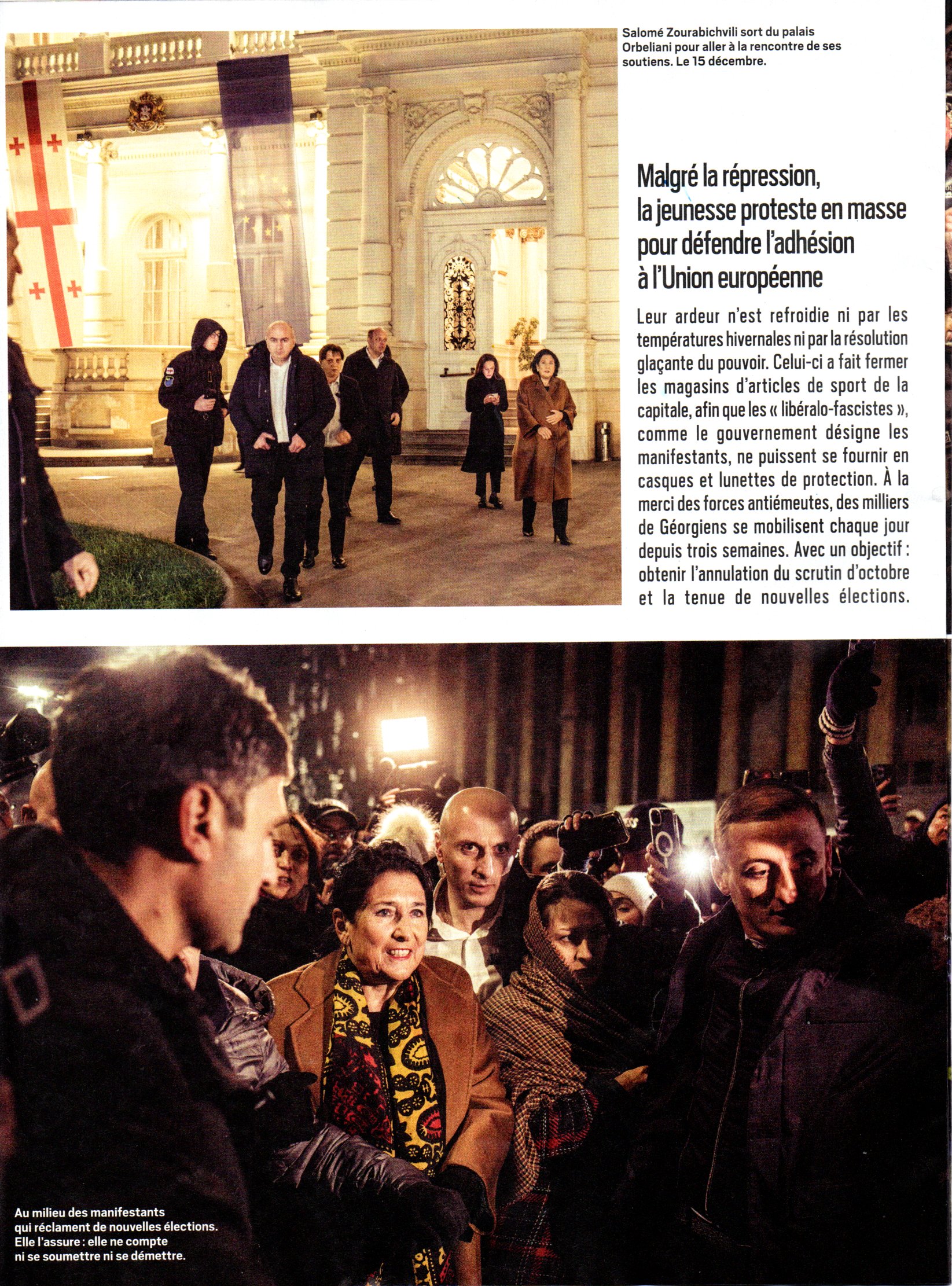 პრო-ევროპულ პრეზიდენტსა და პრორუსულ მთავრობას შორის ომს ახალი შემობრუნება შეეძლო 29 დეკემბერს, მისი მანდატის დასრულების თარიღს. ათასობით დემონსტრანტის მხარდაჭერით, ეს საფრანგეთში დაბადებული ქალი, ყოფილი დიპლომატი Quai d'Orsay– ში, უარს ამბობს მისი პოსტის დატოვებაზე. ტონი მშვიდია, მაგრამ მიმზიდველობის გარეშე. "არა ფოტო. მე დავარცხნილი არა ვარ როგორც ჩვეულებრივად არც გრიმი ნახევარ ღიმილით: "თუ არ გსურთ პრეზიდენტის დეგრადირებული იმიჯის მიცემა?" როდესაც Le Monde ს თბილისში, ოთხშაბათს, 4 დეკემბერს გამართულ საპრეზიდენტო სასახლეში შეხვდა, 72 წლის სალომე ზურაბიშვილი მმართველი პარტიის მიერ პოლიტიკური მოწინააღმდეგის დაკავების შემდეგ კიდევ ერთი საგანგებო შეხვედრიდან გამოვიდა. უნაკლო გარეგნობით და უნაკლო ლურჯი ქურთუკით, რომელიც მის თვალებს ემთხვევა, საქართველოს პრეზიდენტი , მაგრამ მან სხვებზე უკეთ იცის სიმბოლოების ძალა, რომლის ფუნქციაც არსებითად საპატიოა. არავითა შემთხვევში არ უნდა აჩვენოს რომ დაღლილია იმ დროს , როდესაც მისი ქვეყანა თავის ისტორიაში ერთ-ერთი ყველაზე სერიოზული კრიზისის წინაშე დგას და როდესაც ის თავად ებრძვის სიცოცხლისთვის. მომენტი საშიშია. "ტრაგიკული", - ამბობს ის. იმის გამო, რომ მას შემდეგ, რაც მთავრობამ 28 ნოემბერს გამოაცხადა ევროკავშირში გაწევრიანების პროცესის შეჩერება 2028 წლამდე, აჯანყება მოხდა კავკასიის ამ ყოფილ საბჭოთა რესპუბლიკაში, ძლივს 3.7 მილიონი მოსახლე. ევროკავშირის კანდიდატის სტატუსის მიღებიდან ერთი წლის შემდეგ, საქართველო ხედავს, რომ ეს ისტორიული შესაძლებლობა რუსეთთან დაახლოების სასარგებლოდ დაკეტილია, რომლის ჯარებმა 2008 წლის ომის შემდეგ მისი ტერიტორიის 20% დაიკავეს. ეს გეოპოლიტიკური ცვლილება, რომელიც უპრეცედენტოა 1991 წელს სსრკ-ს დაცემით ქვეყნის დამოუკიდებლობის შემდეგ, ქართველების ღალატად აღიქმება, რომელთა 80% ამბობს, რომ მხარს უჭერს ევროკავშირში ინტეგრაციას. თითქმის ერთი თვის განმავლობაში ათასობით ადამიანი ყოველდღე ავლენენ მმართველი პარტიის წინააღმდეგ, რომლებიც კრემლის ანაზღაურებაში, ევროპული მომავლის მოპარვასა და საქართველოს ავტორიტარიზმში ჩაძირვაში ადანაშაულებდნენ. შოკი იმდენად დიდია, რომ ზოგიერთი ქალაქი პირველად მობილიზებულია 1905 წლიდან. ბოლო იმედი მთავრობასა და საკუთარ ხალხს შორის ამ შოუში სალომე ზურაბიშვილი, რომელიც ხელისუფლებაში 2018 წელს ხელისუფლებაში მოსვლისას დაგმეს, განასახიერებს მომიტინგეების ბოლო იმედს, რომ ევროპულ გზაზე დარჩნენ და "ქართული ოცნების" დაასრულონ. "ეს რუსეთის დაბრუნებაა", - აჯამებს პ