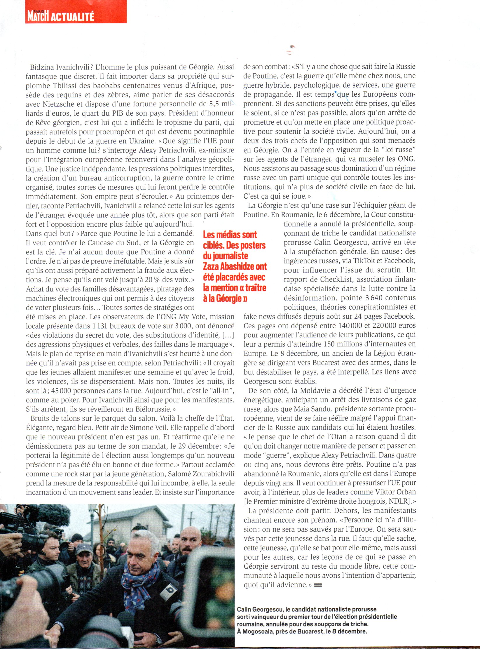 დაჩქარებული რუსიფიკაცია დემონსტრანტებმა, ოპოზიციამ და გამავალმა პრეზიდენტმა სალომე ზურაბიშვილმა, რომელიც აცხადებს, რომ მისი ვადის დასრულების მიუხედავად "ერთადერთი ლეგიტიმური პრეზიდენტი" რჩება, უარყო ამ არჩევნების შედეგი, რომელიც მან მოსკოვის დახმარებით "გაყალბებულად" მიიჩნია და ერთს ითხოვს საპროტესტო აქციები მთელი ქვეყნის მასშტაბით გავრცელდა, როდესაც მთავრობამ 28 ნოემბერს ევროკავშირის (ევროკავშირის) მიერთების პროცესის შეჩერება 2028 წლამდე, კანდიდატის სტატუსის მიღებიდან ერთი წლის შემდეგ გამოაცხადა. გამოკითხულთა 80% ევროკავშირის ინტეგრაციის მომხრეა, რაც ღალატს გმობს. მოქნილი ქვეყნის არაფორმალური ოსტატის ბიძინა ივანიშვილის რეჟიმი რეპრესიებს აძლიერებს. მილიარდერი ოლიგარქი, რომელსაც 2010 წლიდან აქვს ფრანგული პასპორტი და რომელსაც საფრანგეთმა ღირსების ლეგიონი 2021 წელს მიანიჭა, ხელმძღვანელობს საქართველოს დაჩქარებულ რუსიფიკაციას, მოსახლეობის აბსოლუტური უმრავლესობის ნების საწინააღმდეგოდ. ორშაბათს პარიზი, მიხეილ ყაველაშვილის ინაუგურაციის შემდეგ ჯერ არ რეაგირებდა. Faustine Vincent (Le Monde 30 12 2024) En Géorgie, le pouvoir renforce son arsenal répressif Le prorusse Mikheïl Kavelashvili, président contesté de l’ancienne république soviétique du Caucase, a approuvé, tout juste investi, une série d’amendements législatifs. Des mesures destinées à mettre au pas le mouvement de contestation proeuropéen et les fonctionnaires. Par Faustine Vincent ( Le Monde ) La Géorgie opère un tournant autoritaire à une vitesse vertigineuse. A peine investi, le président contesté de cette ancienne république soviétique du Caucase, le prorusse Mikheïl Kavelashvili, a approuvé une série d’amendements législatifs visant à écraser le mouvement de contestation proeuropéen et à mettre les fonctionnaires au pas. Ces mesures, entrées en vigueur lundi 30 décembre, augmentent considérablement les amendes pour les protestataires, facilitent le licenciement des fonctionnaires et les détentions extrajudiciaires, élargissent le champ des nominations politiques dans la fonction publique et simplifient le recrutement des forces de police. « Le régime met en place l’arsenal législatif pour justifier une répression violente à grande échelle, la détention arbitraire et la torture des manifestants, explique Davit Zedelashvili, spécialiste du droit constitutionnel et chercheur au groupe de réflexion indépendant Gnomon Wise, à Tbilissi. Il complète cela par des mesures visant à purger le service public et à s’assurer de la loyauté des fonctionnaires. Ce schéma, bien connu en sciences politiques, vise à consolider l’autoritarisme. Tout ce processus va s’accélérer. » Les accessoires prisés des manifestants (masques pour se protéger des gaz lacrymogènes, gadgets laser, feux d’artifice…) sont désormais interdits. Se couvrir le visage pendant les rassemblements entraînera une amende de 2 000 laris (680 euros), l’équivalent de deux mois de salaire. La détention de feux d’artifice est passible d’une amende de 5 000 laris. Utiliser un appareil laser entraînera une amende de 2 000 laris. Placer sans autorisation des pochoirs, des inscriptions ou des affiches qui « nuisent à l’apparence de la ville » coûtera jusqu’à 1 000 laris. Les barrages, auxquels recourent les opposants au régime, sont également ciblés. Si une manifestation occupe une route mais que la police estime que le nombre de participants est insuffisant pour justifier le blocage, toutes les personnes présentes pourront être condamnées à une amende de 5 000 laris. Les parents de mineurs ayant été reconnus coupables d’une infraction lors d’un rassemblement écoperont, quant à eux, d’une amende de 100 à 300 laris pour « éducation inadéquate ». Les fonctionnaires, instruments du pouvoir Une nouvelle disposition législative fait aussi craindre une politisation accrue de la police, en permettant de recruter de nouveaux agents sans concours, ce qui était obligatoire jusqu’ici. La société civile redoute que cela permette d’embaucher des voyous parrainés par le parti au pouvoir, Rêve géorgien, et chargés d’attaquer les manifestants. Plus de 460 personnes ont été arrêtées, dont 300 ont été frappées par les forces de l’ordre, sans qu’aucun policier ait été sanctionné, selon l’ONG Transparency International. Les fonctionnaires sont, eux aussi, ame